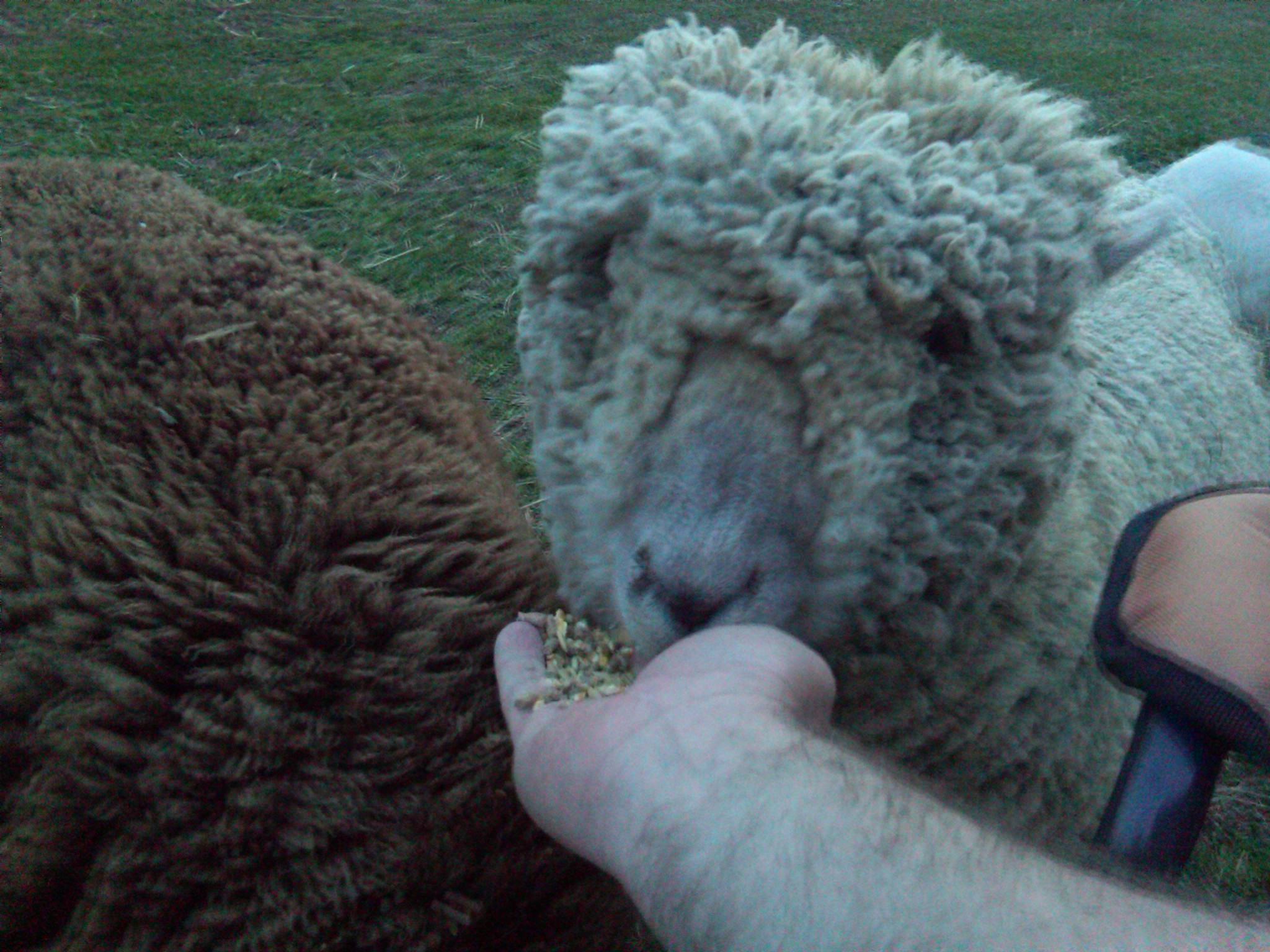 Sheep are a little shy in general; but I had a chance to wait patiently on Pearl, one of our Southdown BabyDoll Sheep, to get her confidence up enough to eat some sweet feed out of my hand.