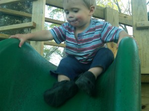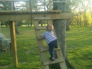 While in the back yard area, all of a sudden I had lost sight of 18 month old Claude for a sec. And then, there he was in the top of our tree house!