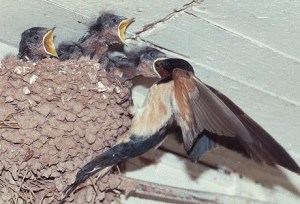 Better duck when the barn swallows are on the move! These birds nest on top of the lights inside the barn and are very active feeding all those babies right now. At first glance, they look a lot like blue birds; but a closer look and you’ll notice their forked tails and white breast. Check out