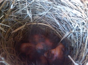 These newborn bluebirds are so new that I can’t even make out what’s what or how many there are in this pic. These are the second family of bluebirds to nest in this box this spring/summer. I also found this awesome picture of an even newer baby blue. Now I just have to protect them from local Shrikes when they come around near time for the bluebirds to fly out of the nest.