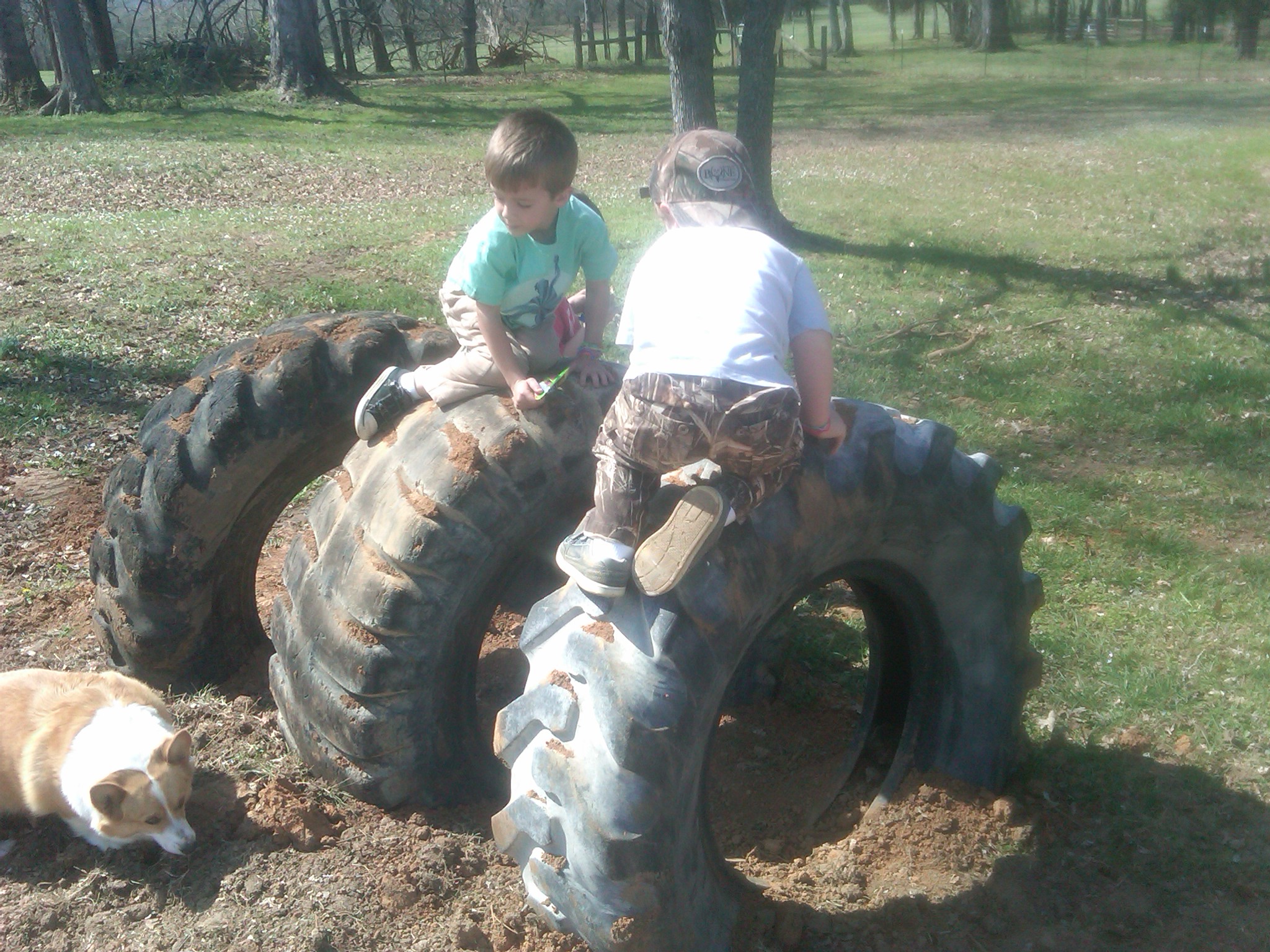 The boys are testing out the newest addition to the playground area. My friends at Gateway Tire gave me these huge old tractor tires. Turns out they make great horses for riding, a cool tunnel for hiding and a good fort for defending.