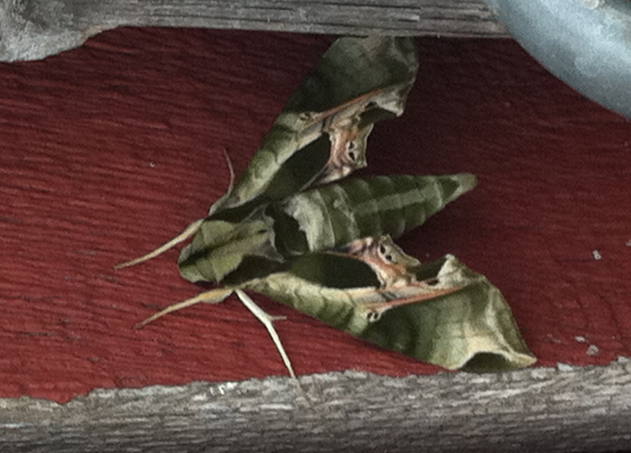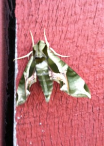 We recently came across this GIANT camo leaf colored moth. It shows up nicely against the red barn; but imagine how hard it would be to see this with a backdrop of leaves or grass. Anybody know what it is??