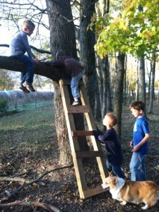 The boys found a new tree they liked as a site for a fort. Only trouble was that the main branch where they plan to hang out was just out of reach. Hubbard had an idea and with my permission they found wood and nails and began to build a ladder. They were certainly proud of their new project…and so was I.