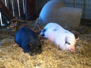 Our two mini pigs have grown up fast. Baby (black) & Piggy are never far apart. Mini pigs have turned out to be a wonderful addition to our family farm. They are extremely curious, very social and always start lots of fun conversations with friends!