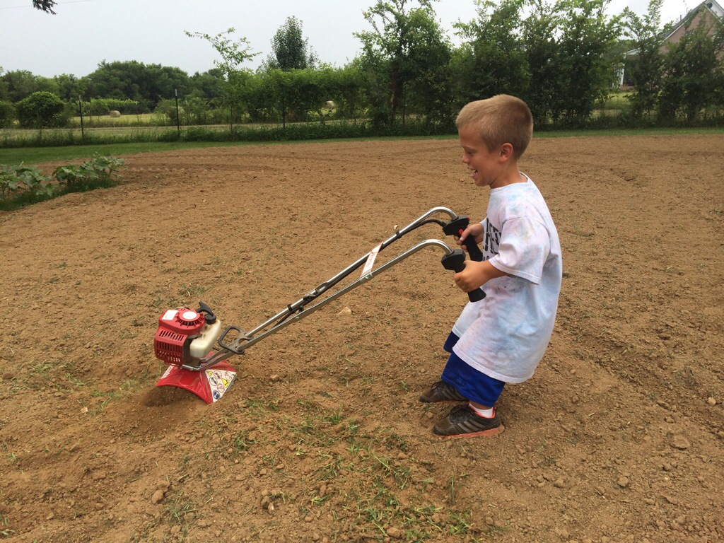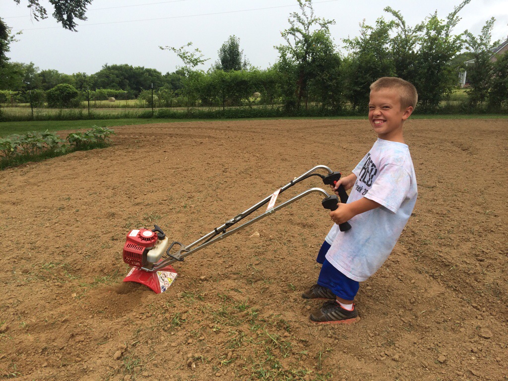 Running a tiller is one of those things that’s a little harder than it looks; but it was a good chance for Jack Boone to get some practice as we continue to battle the weeds in the garden. This is a light weight mantis tiller/cultivator and it’s great for getting up close to the plants.