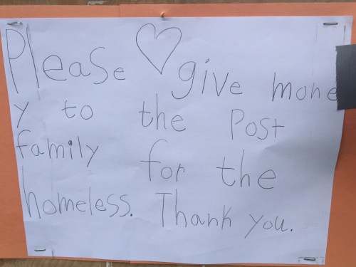 Cousin Violet raised over $30 for the homeless and she’ll donate it at church tomorrow.