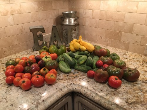 All the hard work of spring finally pays off…tomatoes and cucumbers and squash coming in nearly day. This year I started the tomatoes from seed. And I have a strict “no tomato left behind” policy. We either eat them or share them. Mouth sores all summer are a small price to pay for Cherokee Purples and Early Girls at every meal.