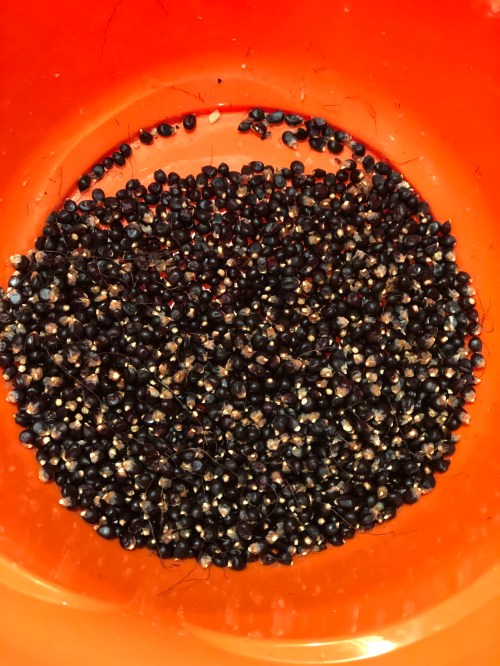 Galloways are big popcorn fans and growing your own popcorn is super fun. In addition to two other varieties, this year we tried Dakota Black Popcorn variety from Baker Seed Co. Small cobs, easy to grow. And it looks so different that it catches everyone’s eye.